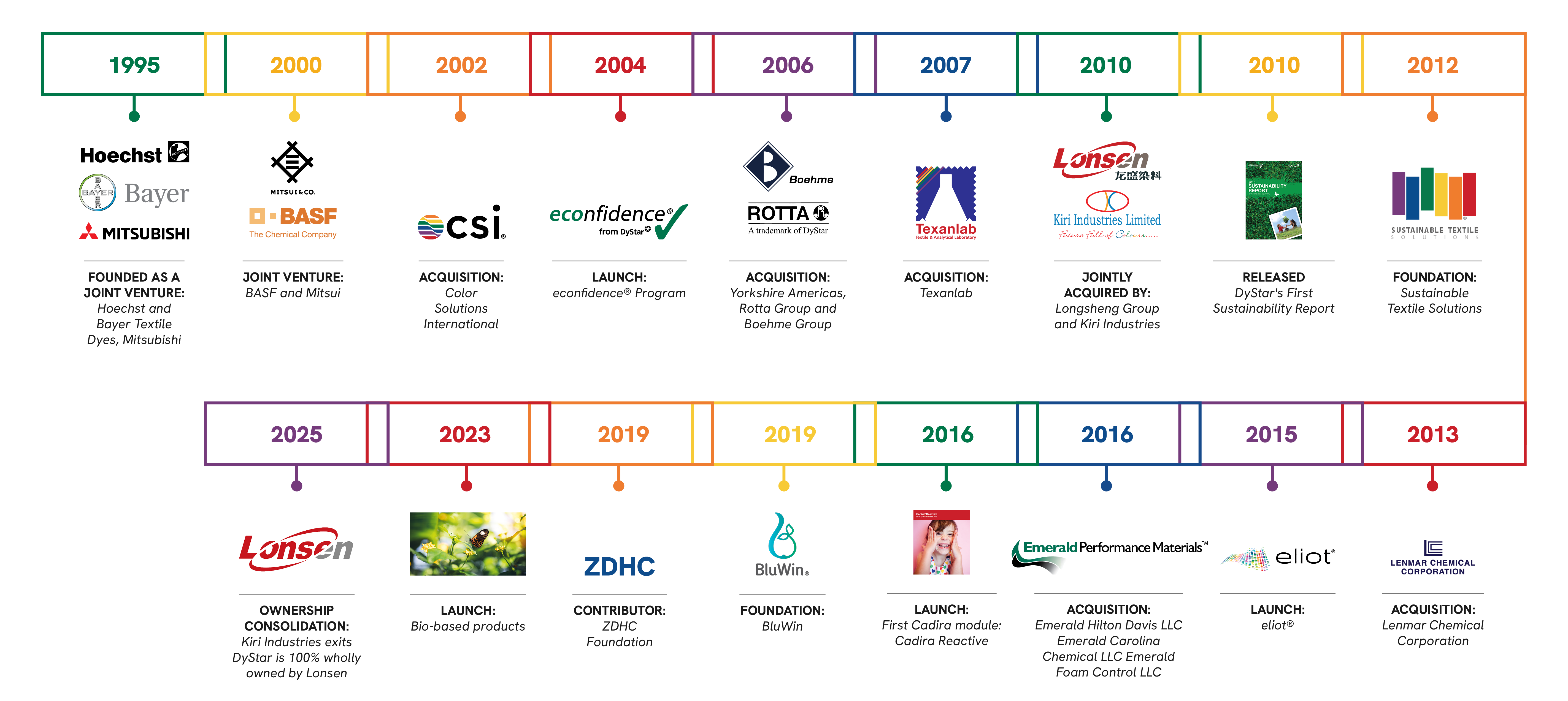 DyStar, founded in 1995, started as a joint venture company comprised of Hoechst AG, Bayer Textile Dyes, and Mitsubishi. Adding to the family, DyStar integrated the textile dyes business from BASF including ICI/Zeneca Dyes and Mitsui into the company, establishing DyStar as a coloration specialist.
